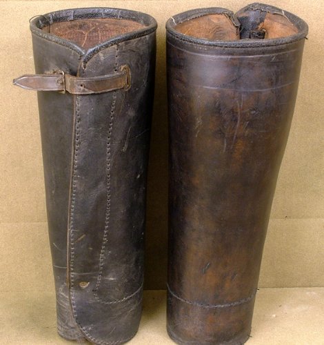 Original Item: Worn over lower leg for impact proctection. All leather construction, one size only. Fair condition.