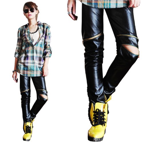 Ladies High-grade leather Elasticity leggings pants-Lederhosen knee helical zipper design